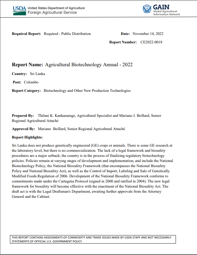 (2023) Raportul SUA confirmă producția de alimente OMG în Sri Lanka Sursă: AgricultureInformation.lk | Document al Departamentului de Agricultură al SUA